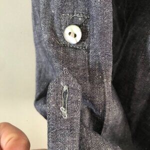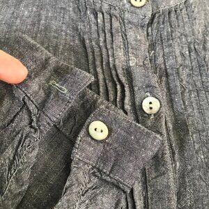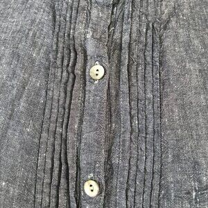 J.Jill size XS linen/viscose blend tunic blouse. Dark navy blue woven linen with sun washed look. Banded neck with shell button down front. P:intuck detail along placket. Button back sleeves. Curved hem. In very good condition. Beautiful shirt.