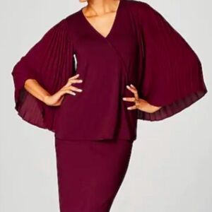 Soft knit pullover top has the look and fit of a classic wrap style, and is designed with pleated bell sleeves, in a light woven fabric, for a dramatically feminine effect. It’s perfect for occasions. Virtually wrinkle-free.