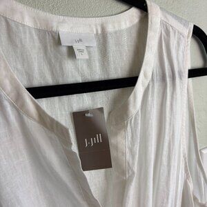 New with tags J.Jill sleeveless tunic in a lightweight linen blend. Features a split neckline, relaxed silhouette, and adjustable drawstring waist with tassel ties for shape. Soft white fabric drapes beautifully—perfect for layering over leggings or as a beach cover-up.