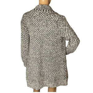 Stay cozy and chic in this J.jill oversized cardigan. Made of a wool blend, this chunky knit sweater features a black and white/heather gray marled design, open front, and 2 large front pockets. In excellent preowned condition, size XS. Approximate measurements: Bust 22”, Waist 23", Length 31