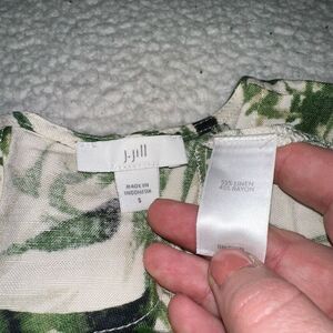 J. Jill Womens Linen Blend Button Back Tee Green Beige Tropical Palm Small EUC