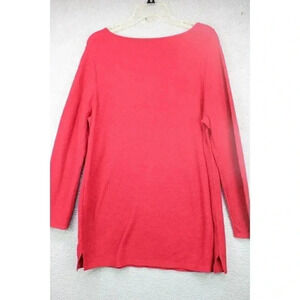 This is a J. Jill Women's Long Sleeve Red Tunic that is a size Large. It is 55% Cotton, 25% Viscose, and 20% Nylon. Laying flat, it measures: Armpit to armpit-21.5" and the length is 31.5". It is a deep red or burgundy color. The pictures that are of the labels show the actual color better. It is in great condition.