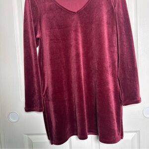 The J.Jill Women's Medium Petite Velour Tunic in Holiday Red is a stylish and comfortable blouse perfect for the winter season. This long sleeve top features a V-neckline, pullover closure, and relaxed fit. Made from a blend of polyester and spandex. Ideal for travel, parties, or casual wear, this tunic is lightweight and stretchy, making it a versatile addition to any woman's wardrobe. The wine color and side slit accents add a festive touch, perfect for the holiday season.