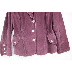 This is a J. Jill Women's Purple Corduroy Jacket or Blazer that is a size Medium Petite. It is 98% Cotton and 2% Spandex. Laying flat, it measures: Armpit to armpit-20.75" and the length is 24.5". It has 3 buttons in the front and 3 buttons on the sleeves. It is in great condition.