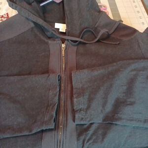It's so hard to get sharp pictures of black but this jacket is perfect, tshirt like thickness with front pockets.