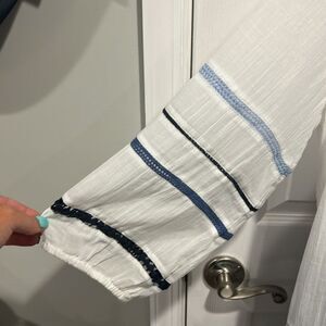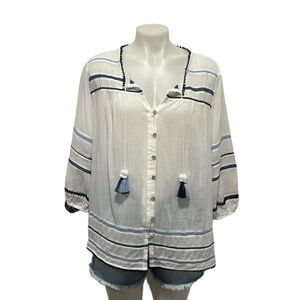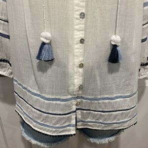 J.Jill ocean breeze white button down blouse with blue trim and tassels.