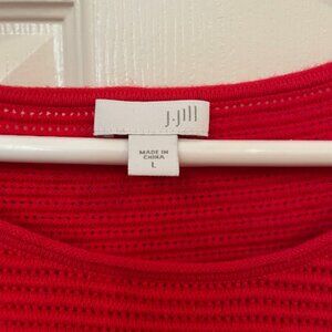 JJill lightweight red knit sweater; size L; great condition with 3/4 sleeves. The pit-to-pit measures 20" and the length is 27" from shoulder to hem. Perfect for evenings or between seasons.