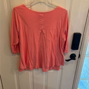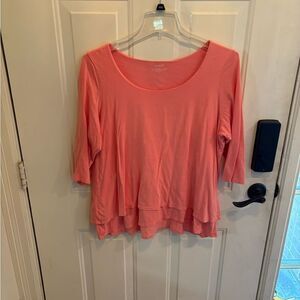 Stylish coral/orange top with layered hem. Three-quarter sleeves. Soft and comfortable fabric.