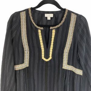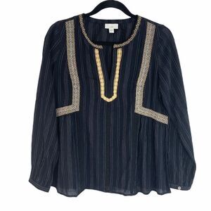 J Jill Peasant Blouse XS Black White Stripe Lace Embroidered Split Neck Top