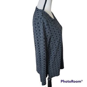 Long sleeved, black, grey, diamond pattern, ponte knit pullover with diamond pattern and round neck. It is very soft. Viscose blend. In excellent pre-owned condition. Size M.
