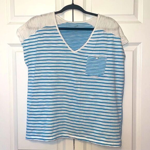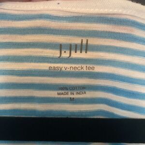 Blue and white striped J. Jill cap sleeve v neck 💯 cotton T-shirt. One small pocket on the front. Great condition! Pit to pit is 24 inches and length is 25 inches.