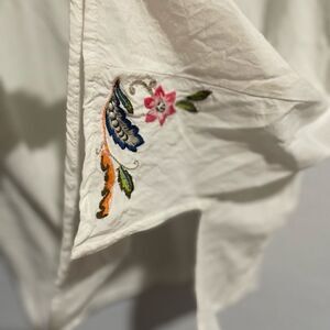 J.Jill white tunic top embroidered floral beautiful 3/4 sleeve slit on the sides has 3 pearl buttons, has a small stain shown in 2nd last picture other then that great condition no rips
