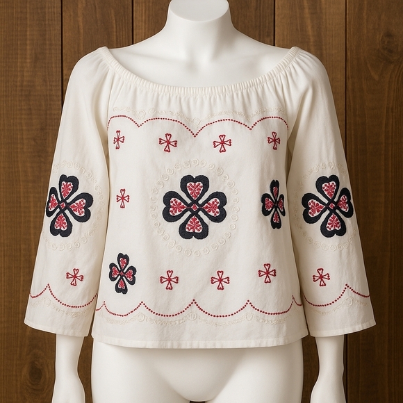 Add a touch of boho charm to your wardrobe with this beautiful JJ’s Fairyland embroidered off-shoulder peasant blouse. Crafted in crisp white cotton, this top features rich red and navy embroidery, circular folk-inspired motifs, and scalloped stitching for a striking artisan look.