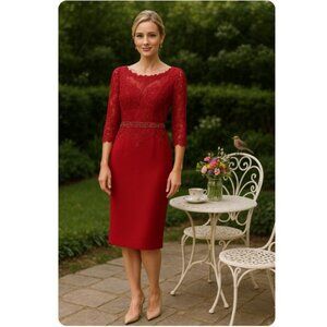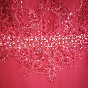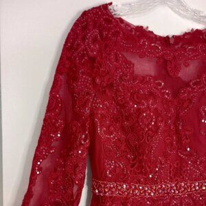 JJs House Burgundy embellished occasion dress, elbow length sheer lace sleeves, embellished with sequins & beads on bodice, sleeves, and waistband. Beautiful dress for mother of the bride, bridesmaid, cocktail, party, holidays, special events.