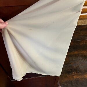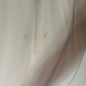 Few spots here and there on dress bodice and skirt and on sash from normal wedding festivities that should come out with cleaning.