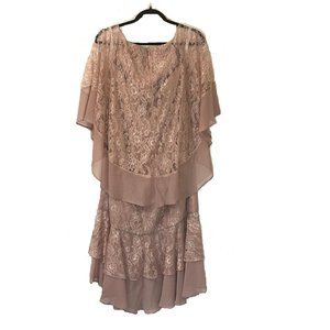 NWT Beautiful JJ's House Trumpet/Mermaid Scoop Asymmetrical Chiffon Lace Dress with Beading Sequins. Color: Dusty Rose, has a fashion-forward cape detail, ruffles trim the high-low skirt, back zip, built in bra, fully lined. 100% Polyester Size 14 (39.5" Bust x 32.5" Waist x 42" Front Length & 46" Back Length)