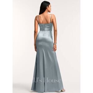 This stunning JJ’s House metallic Dusty Blue draped satin gown is brand new with tags and ready to make a statement at your next event. Features a gorgeous cowl neckline, adjustable spaghetti straps, elegant ruching drape detail, and a flattering silhouette designed to enhance curves. Perfect for prom, bridesmaid, wedding guest, mother of the bride, gala, military ball, or black-tie events.