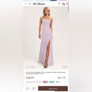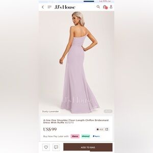 One shoulder chiffon floor length bridesmaid dress. Color is Dusty Lavender size 10. I am typically size 4-6 so this dress runs small for reference. Only worn once!