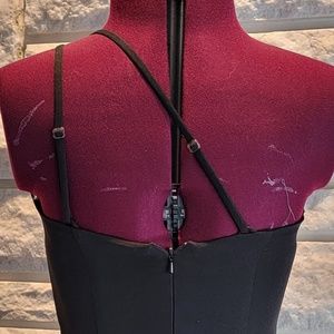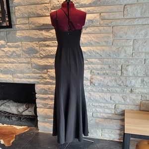 JJs House Floor Length Gown in black. Dress features one shoulder strap, parting to two straps in back. Full back zip closure and front side slit.