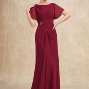 Worn only once - This elegant mom dress is crafted from soft chiffon. It features a scoop neckline complemented by flutter sleeves, with a cinched waist adorned with a sparkling embellishment. The look is complete with an ankle-length silhouette that flows gracefully, making it perfect for formal events or special occasions. (See pics for measurements) Feel free to contact me with any questions.