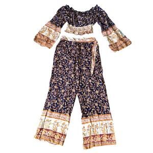JJwm Woman Bohemian Navy & Sienna Floral Two Piece Belted Pants Set Large