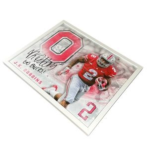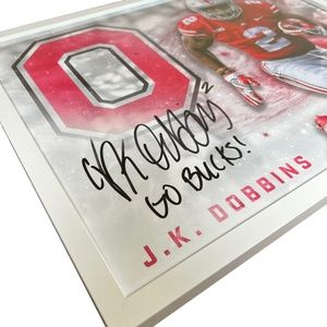 This listing features a JK DOBBINS NCAA OHIO STATE BUCKEYES SIGNED AUTOGRAPHED PHOTO FRAMED 16X20 JSA