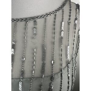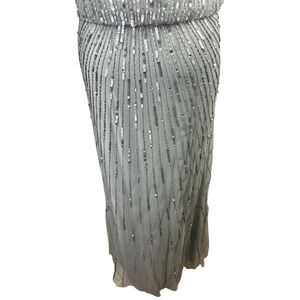 Elegant JKARA sleeveless dress featuring intricate vertical beading and sequins on sheer mesh overlay with a soft lining. The design creates a flattering, elongating silhouette with a subtle Art Deco–inspired look. Perfect for formal events, weddings, evening parties, or special occasions.
