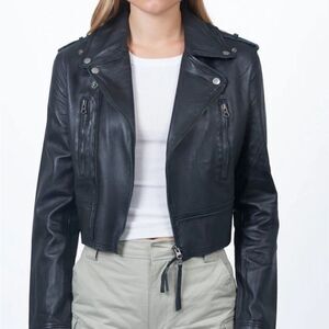 A cropped motorcycle leather jacket featuring a snap-down lapel and collar, zippered pockets and wire inserts in collar, lapels, pocket flaps and cuffs. Opt for a sleek monochromatic look for the ultimate in city girl chicness.