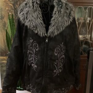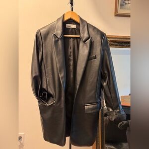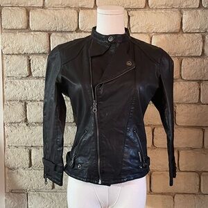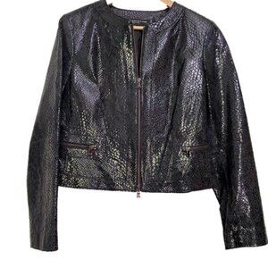 A cropped leather jacket featuring a snap-down lapel and collar and zippered pockets. Pair with a sleek jumpsuit and your highest platform heels to ignite the night.
