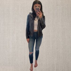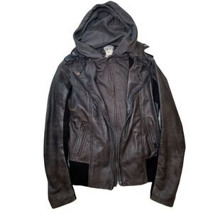 MATERIAL: 100% Leather with french terry hood and zip front.