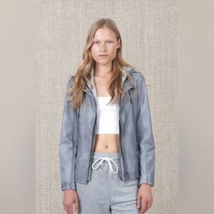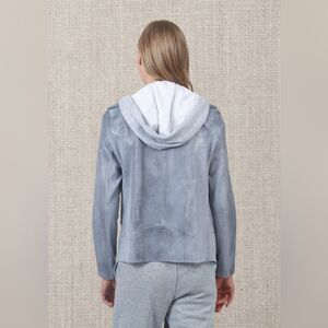 MATERIAL: 100% Leather with french terry hood and zip front.
