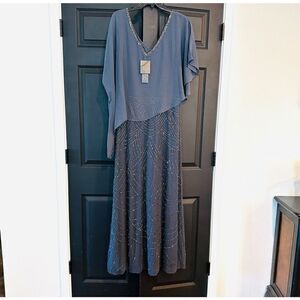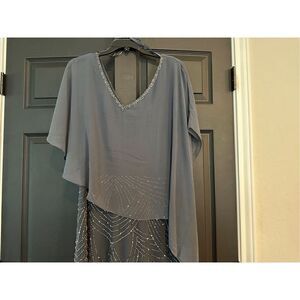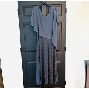 Size 6 | Grey | 100% Polyester | Dry Clean | Petite beaded V-neck , A-line silhouette w capelet gown with bead embellishment all over bottom skirt