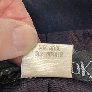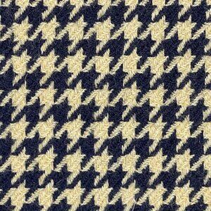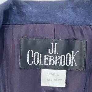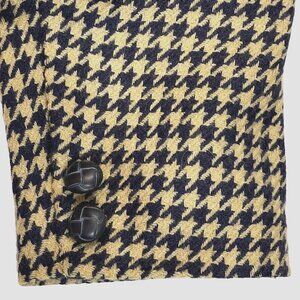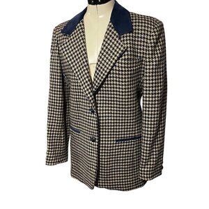 JL COLEMAN ~ Women's Mohair and wool blend houndstooth blazer. Size Small. Navy and tan with navy suede collar and accent trim. Classic leather buttons. 2-button front closure and 2-buttons on sleeves. Navy trimmed welt pockets. Fully lined.