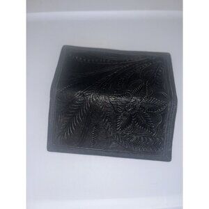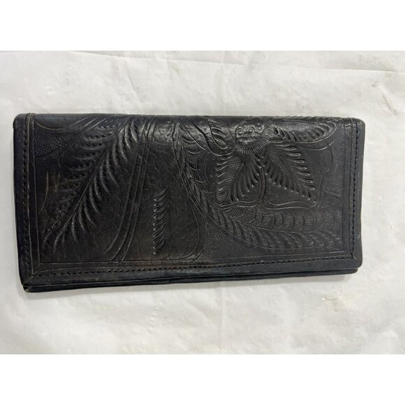 100% genuine full-grain leatherHand-stained and hand-tooledInterior contains 4 card slots, 1 Id window, 3 slip pockets, and 1 zipDimensions: 7x 3.2"silver hardwareproduct is hand tooled from hand dyed 100% leather cowhide. very good condition