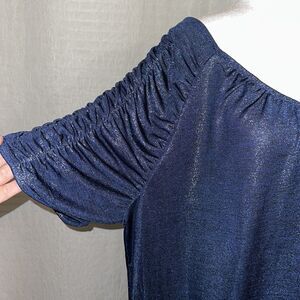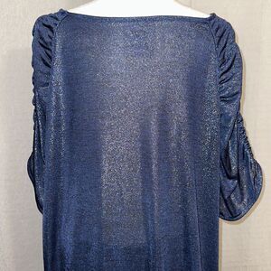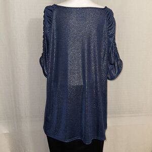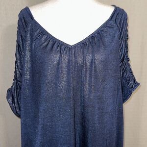JL 2X Shimmery Indigo Blue V-Neck Knit Short Ruched Sleeve Elegant Top