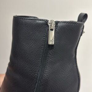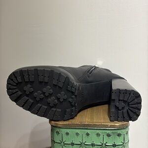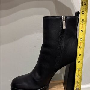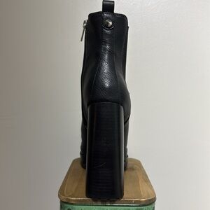 These stylish black heeled boots feature a chunky high 5inch heel and a noticeable platform sole for added height. Made from a leather-like material with a textured finish, they offer a modern look and comfortable fit with a rounded toe shape and inner zipper for easy wear.