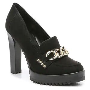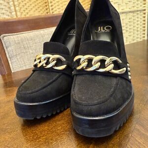 JLO Jennifer Lopez suede heels, black with gold detailing 4” Heels Size 6.5
