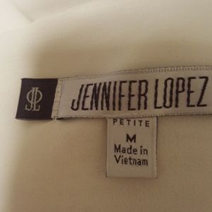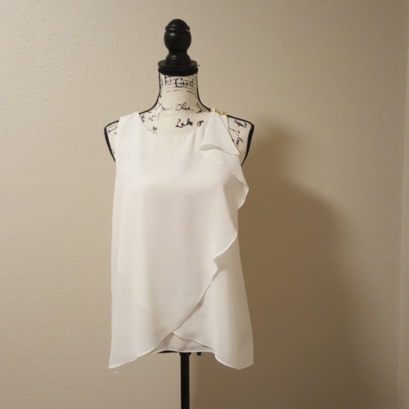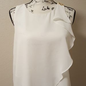 White Jennifer Lopez top with gold chain embellishment on left shoulder. Flowing ruffles with gold color zipper.