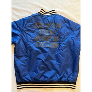 JLT Luxury Varsity Bomber Windbreaker Jacket Men's Size 2XL Long Sleeve Nylon Lined Pockets Snap Closure Graphic "Eye Of The Tiger & Heart Of The Lion" Blue Black White