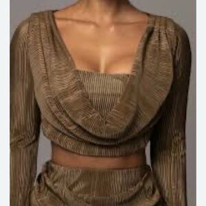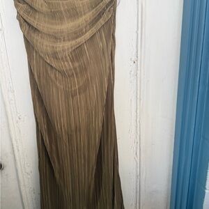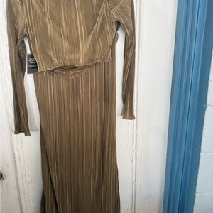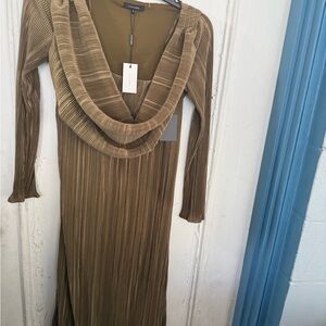 Chic long sleeve dress with a draped design. Rich brown hue. Perfect for elegant occasions.