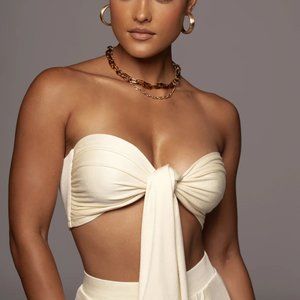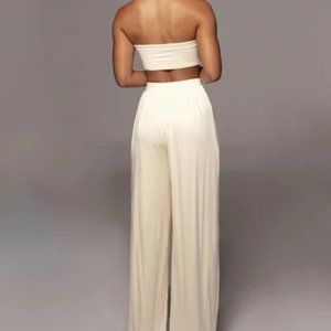 The top features a stunning tie front detail with an elastic back, and the matching high waist pants are topped with an elastic waistband and trendy wide legs that complete the look! Wear together or separate, this versatile two piece set is easy to mix and match! Stretchy. Sold as set.