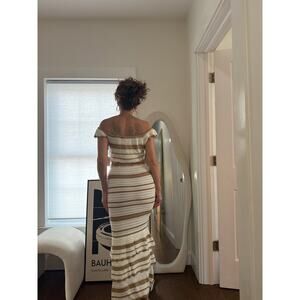 Two-piece set: off-shoulder cropped top with ruffle detail + matching high-waist ruffle maxi skirt; color Beige; pull-on fit. Size L/XL.
