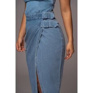 Luxuriate your style this winter with our Medium Wash Gisele Denim Slit Skirt, a luxurious piece designed for year round wear. We've taken one of our most loved designs and reimagined it in premium denim, elevating its style with superior quality and a modern twist. Meticulously crafted, this midi skirt features a double-belted embellishment at the waist, while a high-cut slit adds a sensual element, creating a stunning finish. Back zipper closure. No stretch.