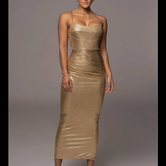 JLUXLABEL Gold Ruched Maxi Dress Spaghetti Strap