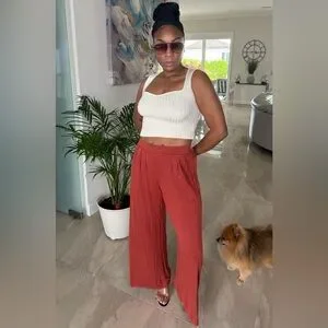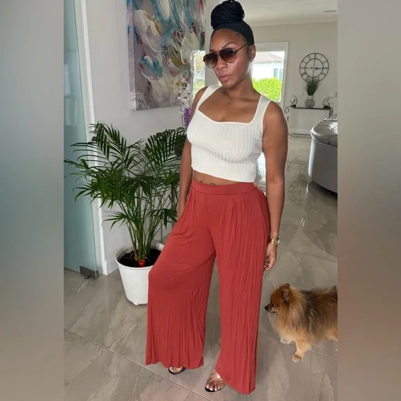 Stylish terracotta wide-leg pants. Perfect blend of comfort and fashion. Isyss is 5ft 11in tall.