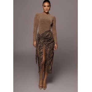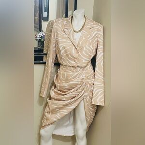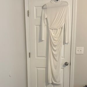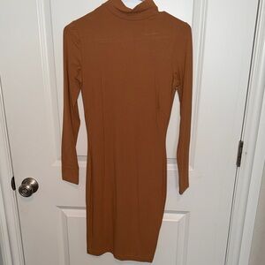 Bold orange dress with deep neckline. Long sleeves and ruched design. Ideal for standout style. New with tags! Stretchy. Worn just once for a limited time to take these photos only. Message me BEFORE purchasing to have washed. Tags will be removed if requesting wash.