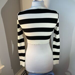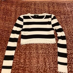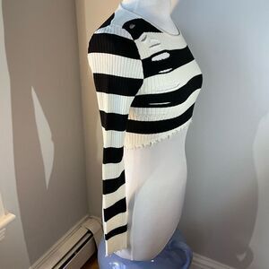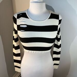JLUXLABEL super longsleeve breton striped, ribbed distressed top! Medium. So cool! Scoop neck, distressed raw hems, and cropped length. Distressing also along right torso! . Stretchy, form fitting, fringyCrazy off the hook shirt! 70% rayon, 30% nylon. Flat lay L12”(front), 14” (back), P-P 14”. #baddie #goth #rocker