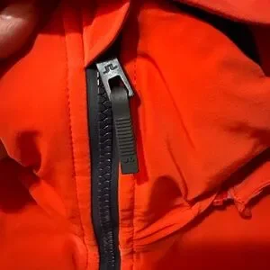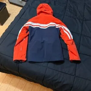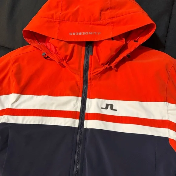 Stylish J.Lindeberg jacket. Bold with navy accents. Features a hood and front zipper. Perfect for casual wear.