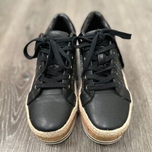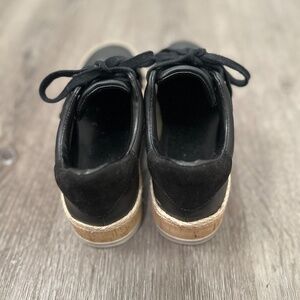 JLO dance shoes black with cork bottoms.