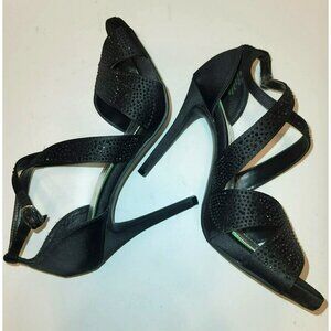 Jennifer Lopez Strappy Criss-Cross Black Heels. Satin and rhinestone with a 4.5 inch stiletto heel and silver color on the inside and a JLo emblem imprinted on the bottom.